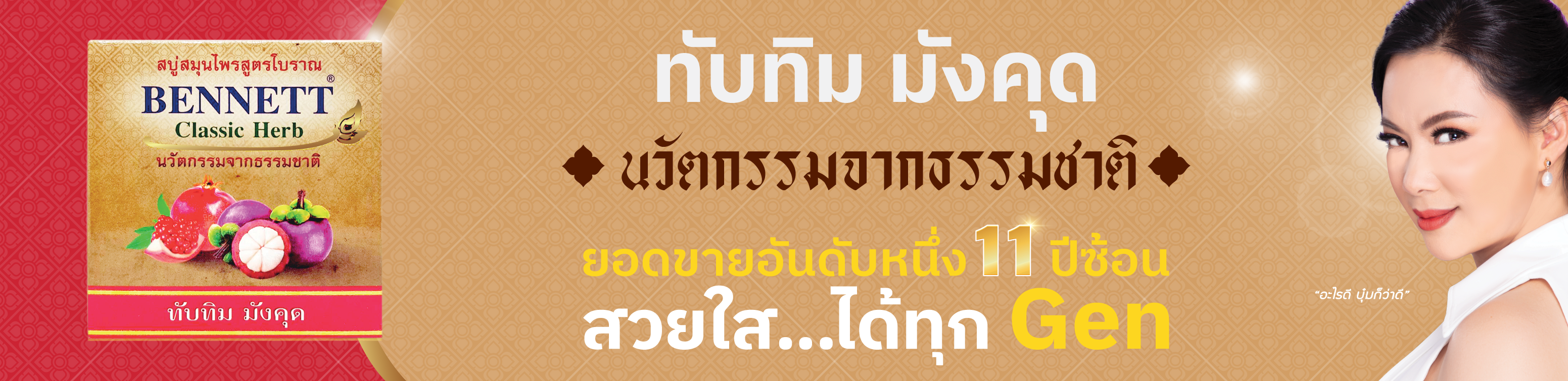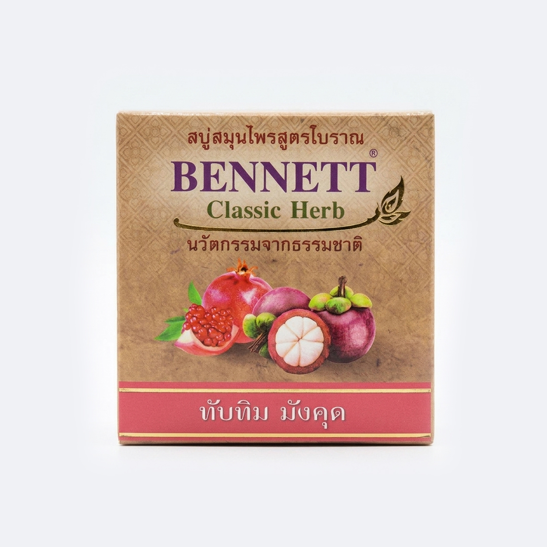 ทับทิม ด้วยทับทิมนั้นเป็นผลไม้ที่มีรสหวานออกเปรี้ยว น้ำทับทิมจึงมี วิตามินซี สูงและยังประกอบด้วยเกลือแร่ต่าง ๆที่มีประโยชน์ต่อร่างกายช่วยบำรุงผิวพรรณให้เปล่งปลั่งสดใสช่วยต่อต้านอนุมูลอิสระในร่างกายและช่วยในการชะลอวัย และน้ำทับทิมมีคุณสมบัติช่วยให้ผิวหน้าเต่งตึง เปล่งปลั่งสดใส เบนเนทจึงนำมาใส่ไว้ในสบู่สมุนไพรธรรมชาติ ให้คุณมีผิวสว่าง กระจ่างใส ดูดีมีออร่า